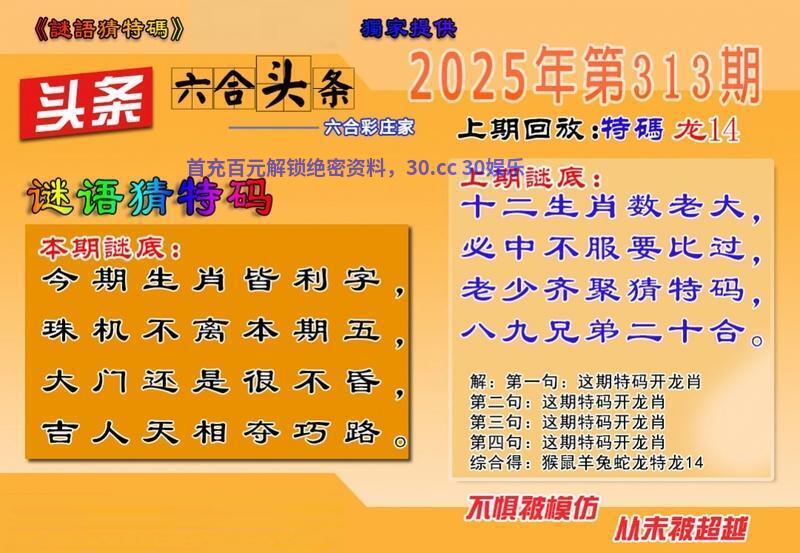 313期 今期生肖皆利字 珠机不商本期五 大门还是很不昏 吉人天相夺巧路 解译:大门还是很不昏指大肖牛马羊狗虎猪,吉人天相夺巧路指天肖牛马龙羊猴猪 九肖:牛马羊狗虎猪兔龙猴 |